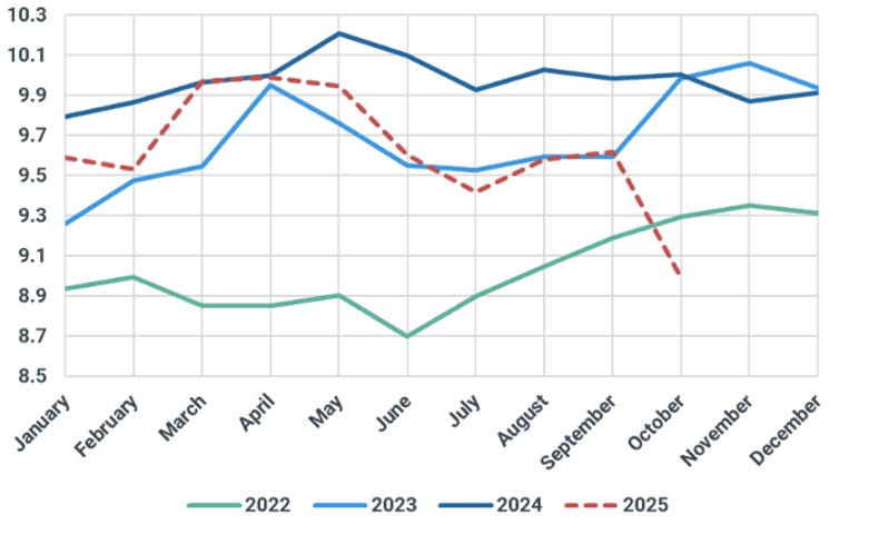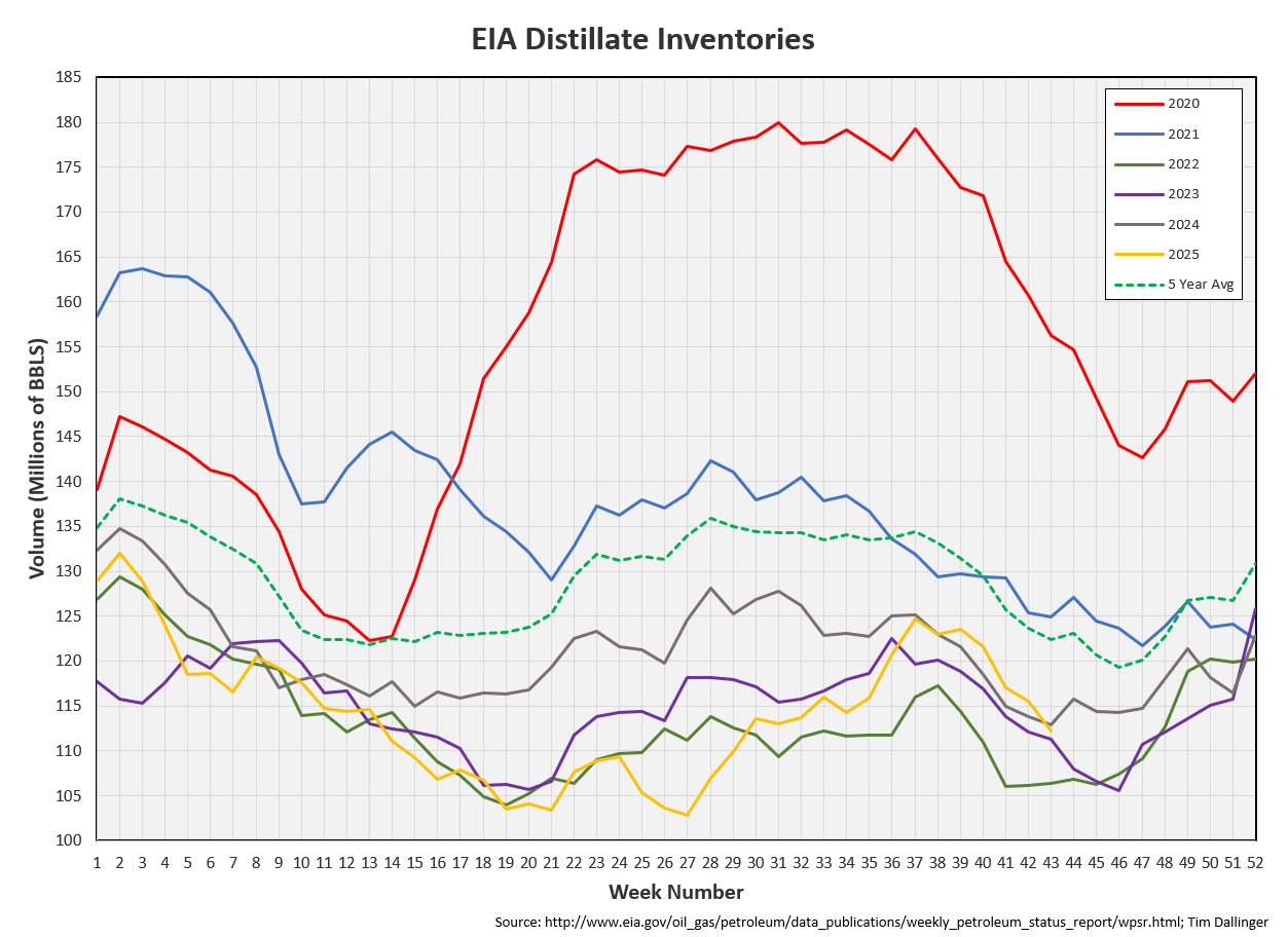 Distillate fuel inventories decreased by 3.4 MMB last week and are about 8% below the seasonal 5-year average. 2025 distillate inventories fall back below 2024 levels.