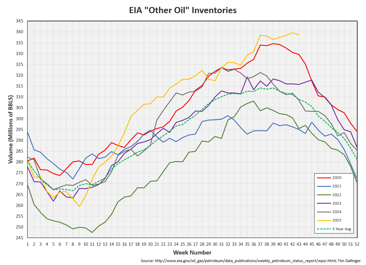 Other oil decreased by 1.1 MMB. Other oil inventories remain at seasonal record highs.