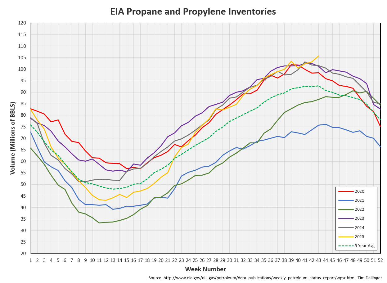 Propane/propylene inventories increased by 2.5 million barrels from last week and are 14% above the seasonal five-year average.