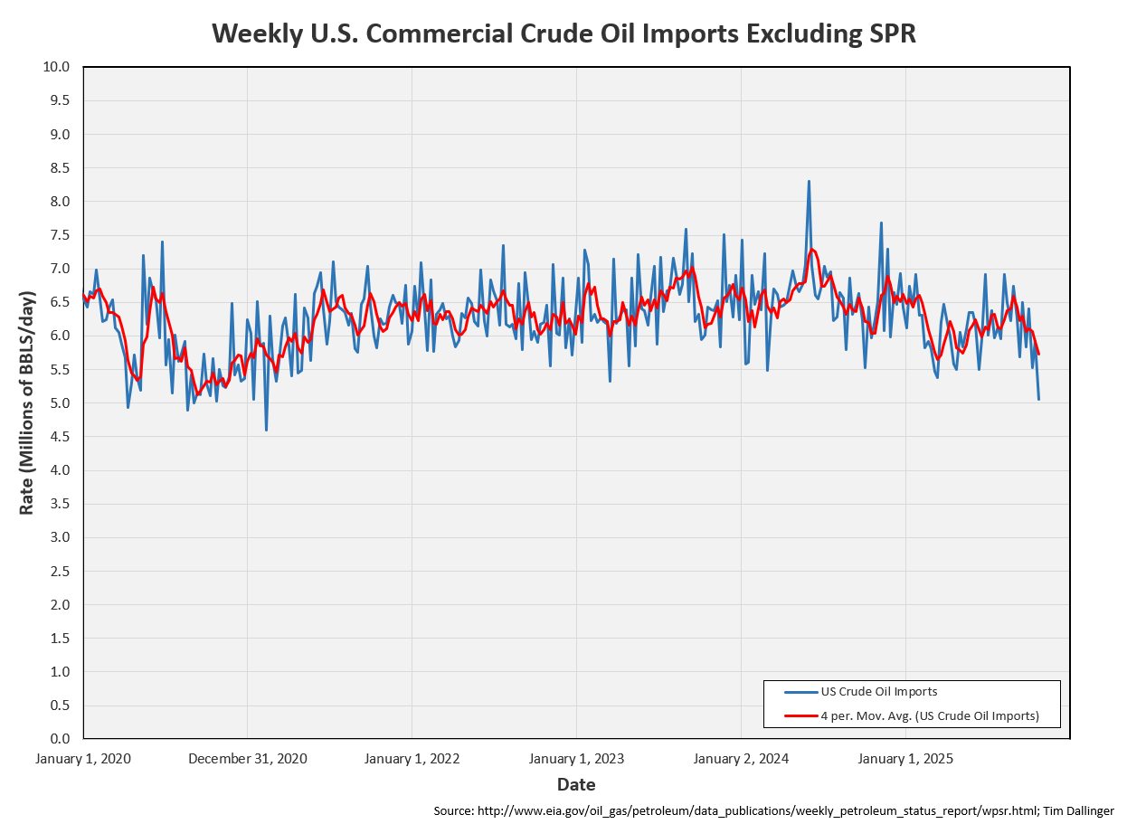 US crude imports cratered. There is no apparent reason. It’s possible that imports were the lowest that they’ve been since 2020. It’s also possible that the over-reporting is crude production is causing issues with the inventory model. Imports should be reported by US customs but there is no way to independently track that data. It’s possible that the BP Whiting facility imported less Canadian crude. But that refinery was back up and running after their fire incident last week.