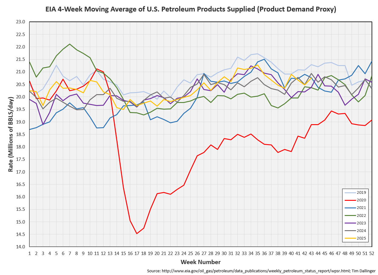 The EIA’s average product demand proxy remains at the top of range.
